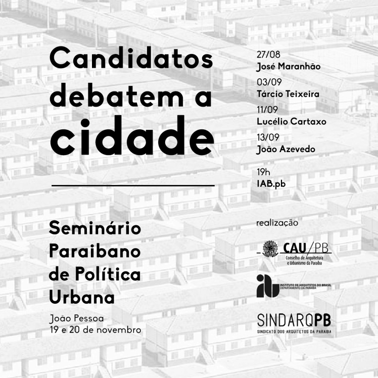 O Colegiado das Entidades de Arquitetura e Urbanismo da Paraíba (CEAU-CAU/PB), formado pelo Conselho de Arquitetura e Urbanismo da Paraíba (CAU/PB), pelo Instituto de Arquitetos do Brasil – Departamento da Paraíba (IAB.pb) e pelo Sindicato dos Arquitetos da Paraíba (SINDARQ-PB) realiza, dentro do Seminário Paraibano de Política Urbana, o evento “Candidatos Debatem a Cidade”.