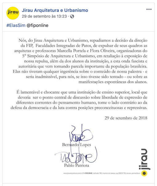 Um dos grupos convidados do evento, o Jirau Arquitetura e Urbanismo, manifestou solidariedade em sua página do Facebook postando uma nota de solidariedade às professoras demitidas: