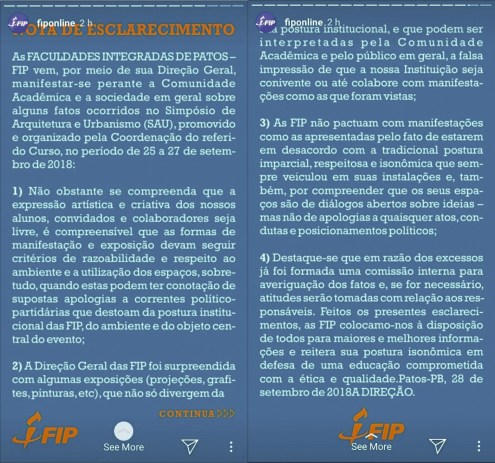 No último dia 28/09, estudantes e professores das Faculdades Integradas de Patos, FIP, foram surpreendidos com o indicativo de demissão de duas professoras de Arquitetura e Urbanismo, uma delas coordenadora de curso. Segundo informações de membros dos corpos discente e docente dessa instituição, a atitude teria sido tomada pela Direção após a repercussão de posicionamentos políticos durante o 5º Simpósio de Arquitetura e Urbanismo das FIP, realizado entre os dias 25 e 27 deste mês. De acordo com relatos e manifestações nas redes sociais, participantes e convidados do evento aproveitaram os recentes protestos e utilizaram a hashtag #EleNão em determinadas atividades. Contudo, dirigentes da instituição entenderam que as manifestações fazem apologia político partidária ferindo o regimento institucional. Em sua conta de Instagram, as FIP fez o seguinte pronunciamento: