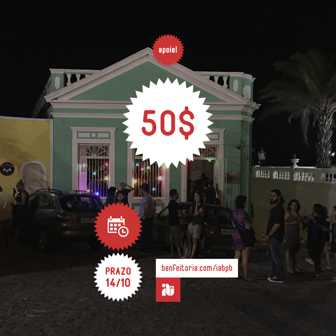Faltam 15 dias para o encerramento da campanha de financiamento coletivo para garantir a sustentabilidade do Centro Cultural IAB.pb. Até o momento, foram arrecadados R$ 4.700,00, o equivalente a 31% do total da meta. Os colaboradores tem até o dia 14/10 para contribuir a bater a meta de R$ 15 mil. Acesse e apoie: benfeitoria.com/iabpb.