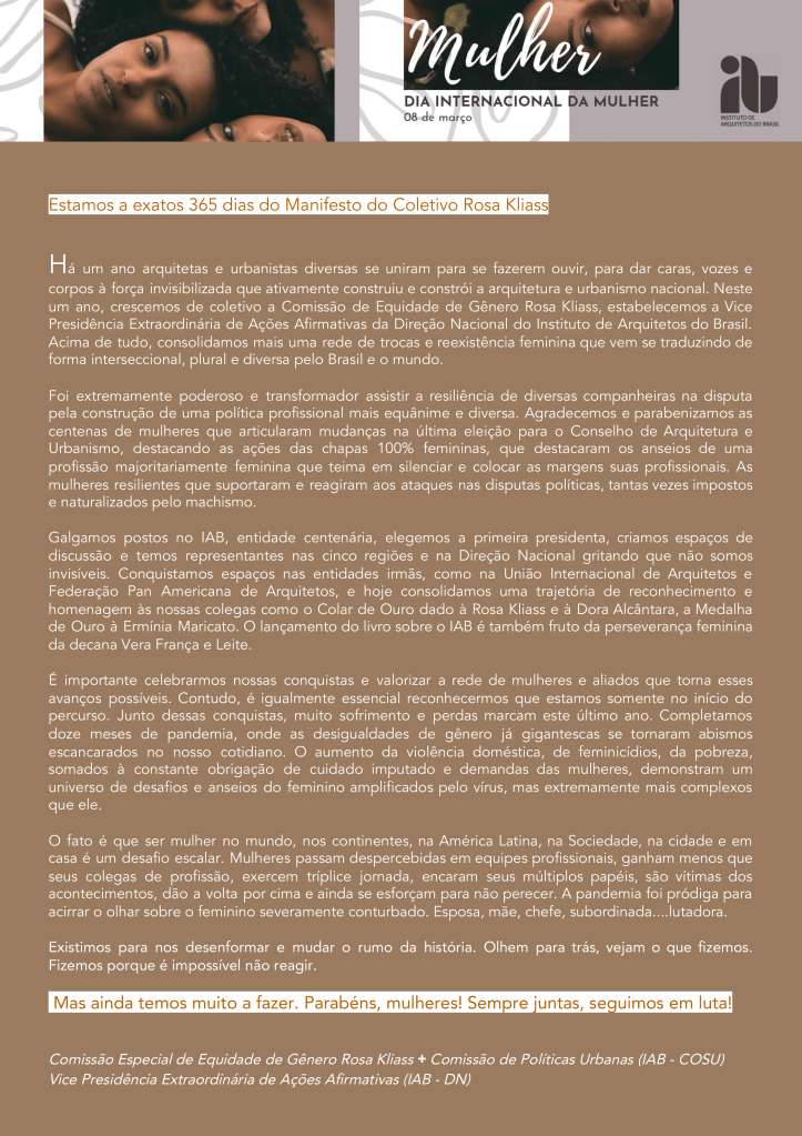 Manifesto do Coletivo Rosa Kliass – Dia Internacional da Mulher Publicado em março 8, 2021 por IAB.pb Compartilhe! Clique para compartilhar no Facebook(abre em nova janela) Facebook Clique para compartilhar no WhatsApp(abre em nova janela) WhatsApp Clique para enviar um link por e-mail para um amigo(abre em nova janela) E-mail Curtir Carregando... Relacionado