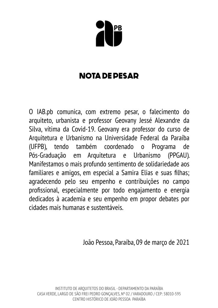 Nota de pesar – Falecimento do professor Geovany Jessé Alexandre da Silva Publicado em março 9, 2021 por IAB.pb Compartilhe! Clique para compartilhar no Facebook(abre em nova janela) Facebook Clique para compartilhar no WhatsApp(abre em nova janela) WhatsApp Clique para enviar um link por e-mail para um amigo(abre em nova janela) E-mail Curtir Carregando... Relacionado