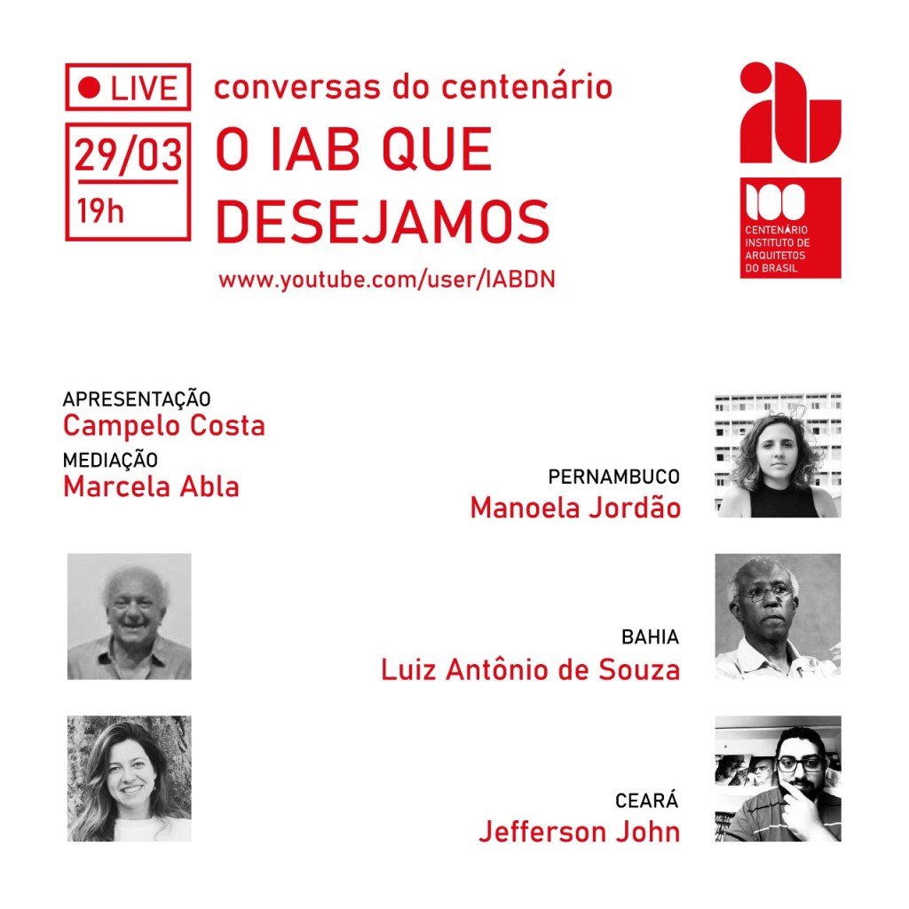 No dia 29 de março, segunda-feira, às 19 horas, acontecerá a segunda Conversa com a arquiteta Manoela Vasconcelos e os arquitetos Luiz Antônio de Souza e Jefferson John, presidentes dos Departamentos de Pernambuco, Bahia e Ceará. Os presidentes estaduais comentarão as metas contemporâneas do “IAB que desejamos”, destacando concursos públicos, ensino e exercício profissional, defesa do patrimônio cultural e do meio ambiente, participação feminina, habitação social e assistência técnica.