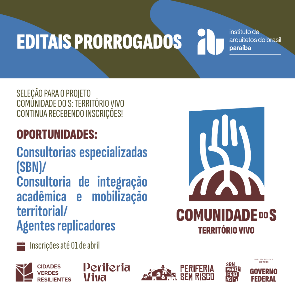 As inscrições para os editais do projeto Comunidade do S: Território Vivo foram prorrogadas até o dia 01 de abril de 2026.
