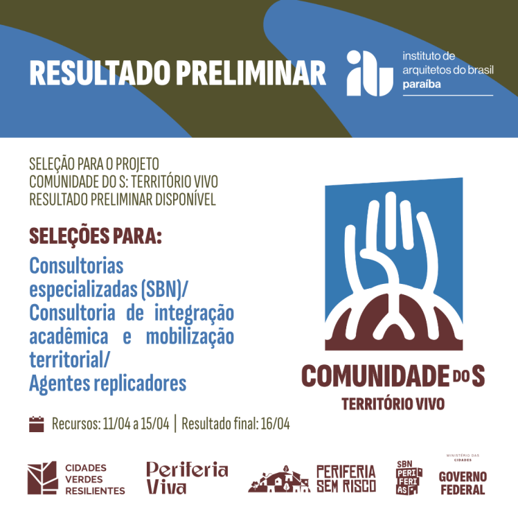Informamos que já está disponível o resultado preliminar dos editais do projeto Comunidade do S: Território Vivo.