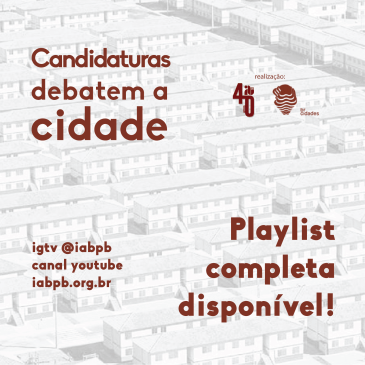 O Instituto de Arquitetos do Brasil Departamento da Paraíba (IAB.pb) realiza o evento CANDIDATURAS DEBATEM A CIDADE, que irá entrevistar candidatos e candidatas à prefeituras das cidades de João Pessoa e Campina Grande. As entrevistas com os candidatos e as candidatas serão gravadas e posteriormente postada sem cortes no nosso site (iabpb.org.br) e nas nossas … Mais CANDIDATURAS DEBATEM A CIDADE _ ELEIÇÕES 2020
